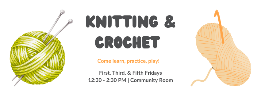 Join us on the first, third, and fifth Fridays from 12:30-2:30 PM in the Community Room to knit or crochet with us!