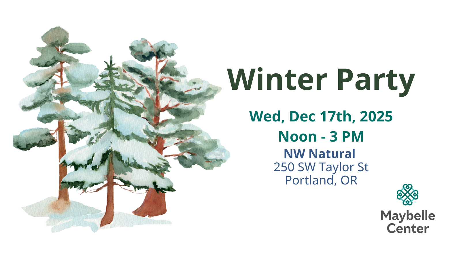 Join us for an afternoon of holiday festivities on Wednesday, Dec 17th, from Noon – 3 PM. We are celebrating at a new venue this year, NW Natural (250 SW Taylor St, Portland, OR)– meet us there!