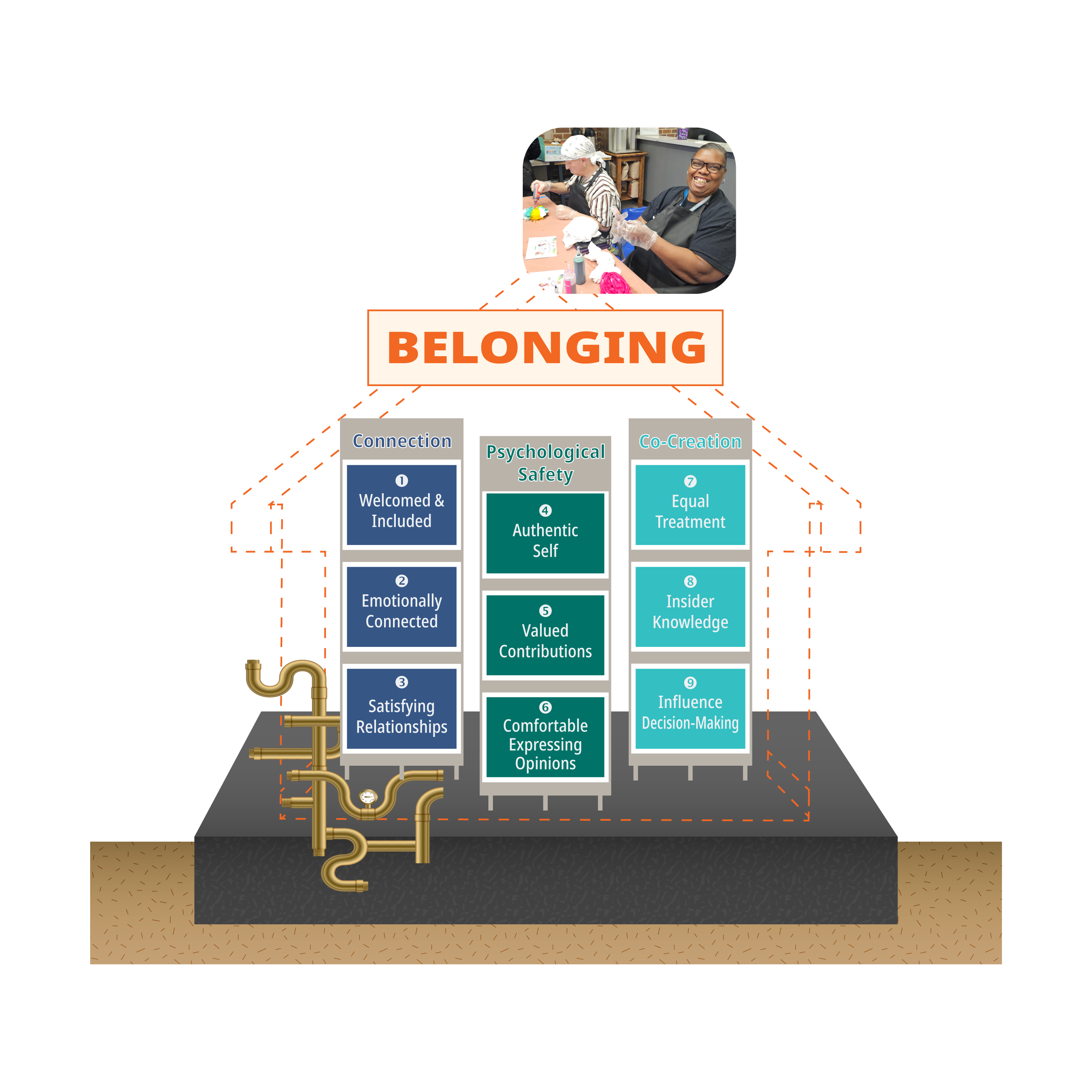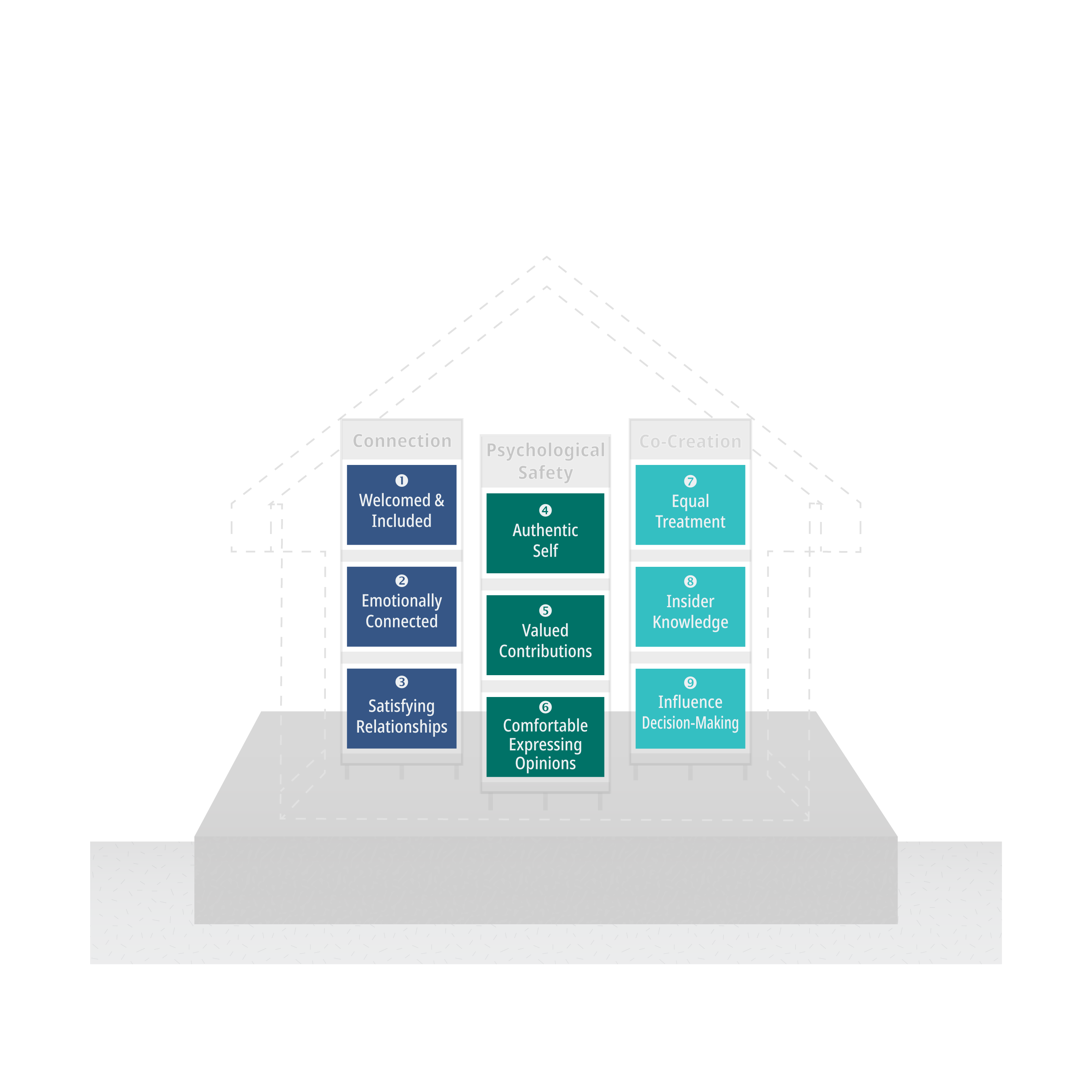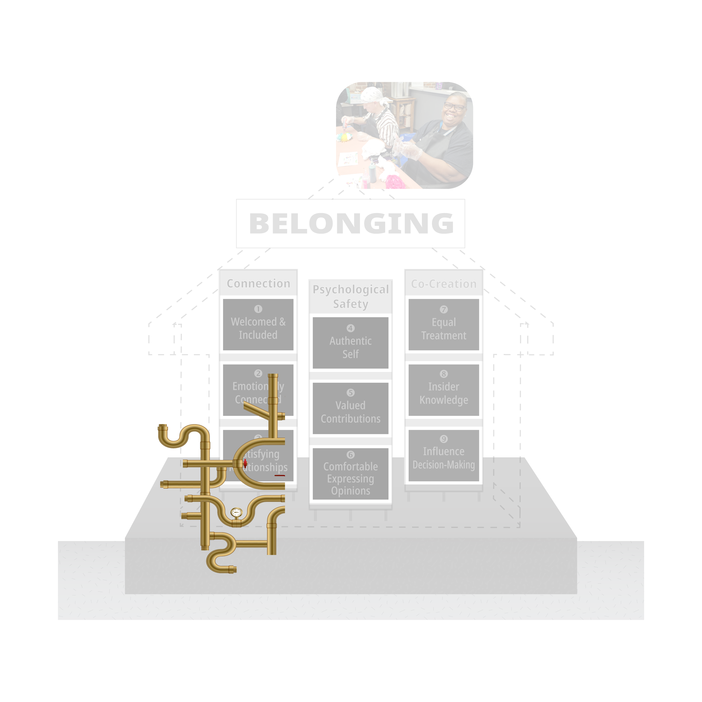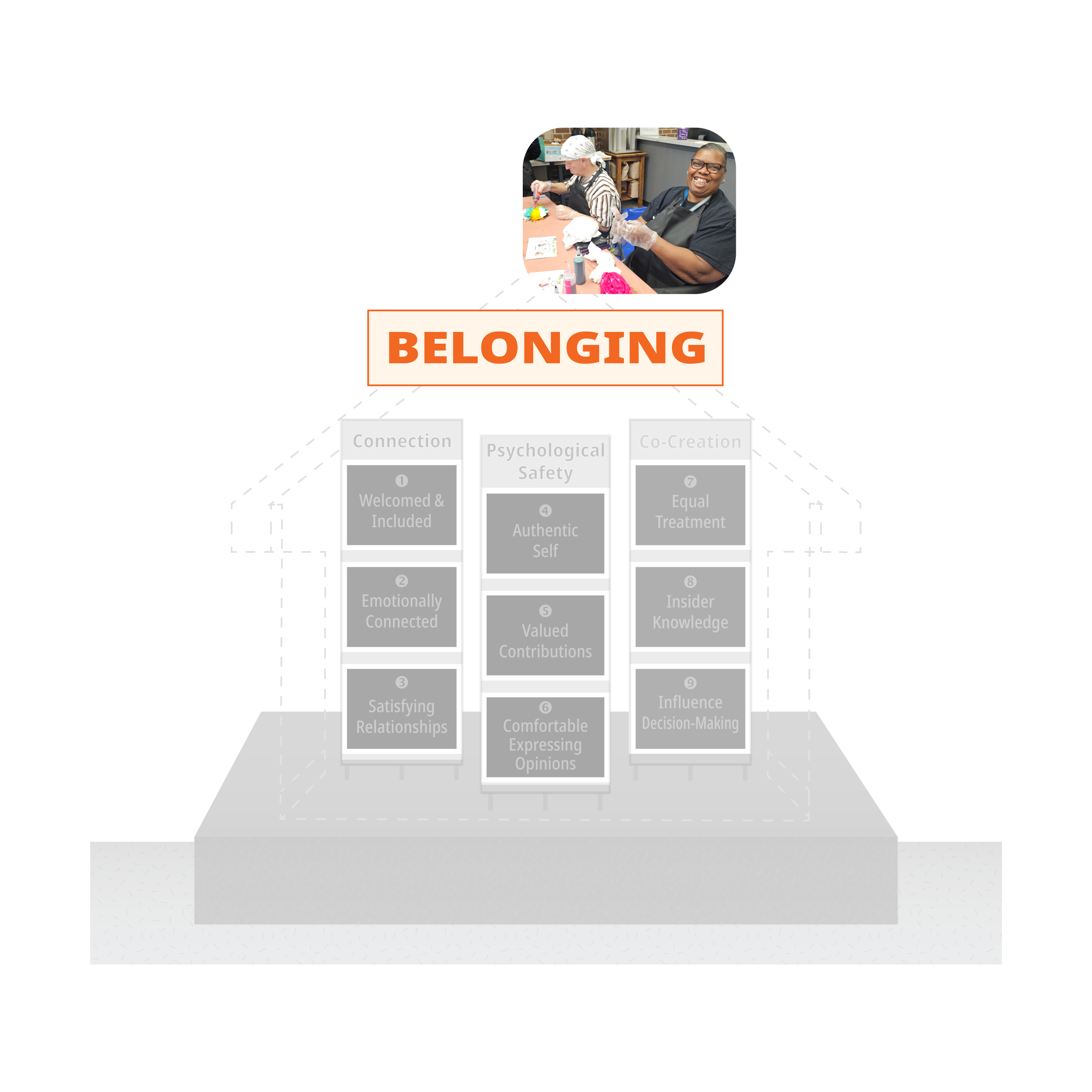Each support column is made up of three building blocks—essential elements people need to truly belong.